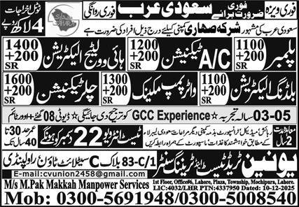 Plumber And Water Pump Mechanic Jobs in Saudia Arabia 2025 announce the Contract career opportunities for the post of See Below Ad in Saudi Arabia for the fresh and experienced candidates on Contract basis who have Check Advertisement degree. Posted date of this post is 21/12/2025 and the last date is 22/12/2025. if you are eligible for this job apply before due date.