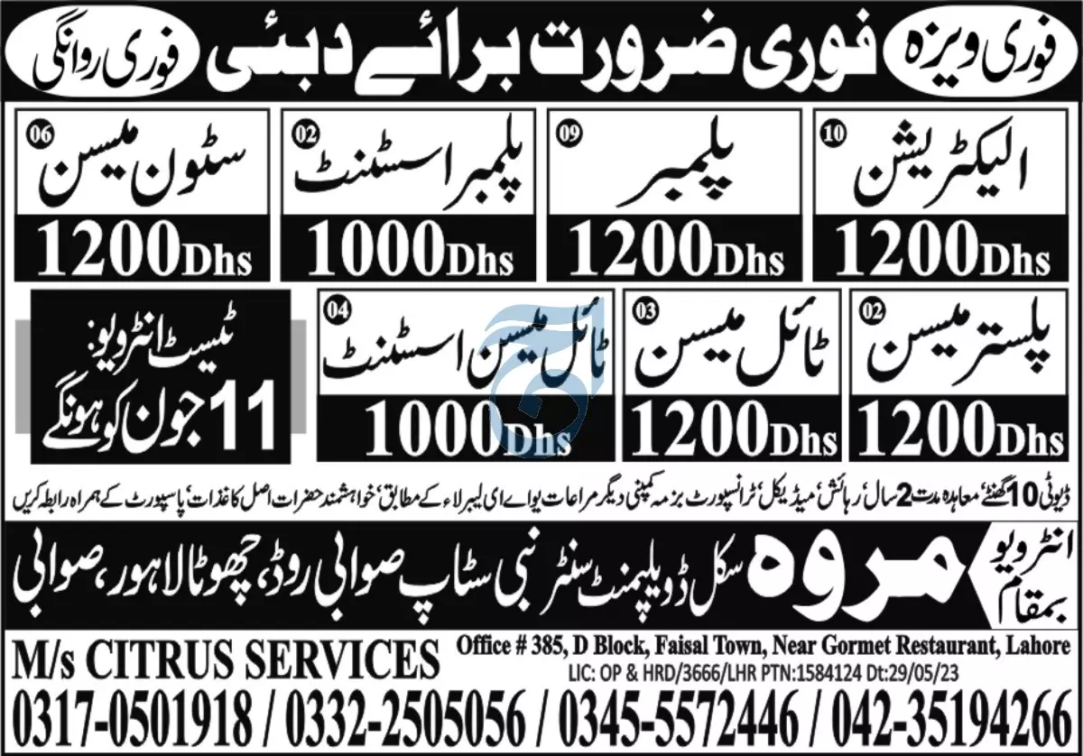 Plumber Plaster Mason & Electrician Jobs In Dubai 2023 announce the Contract career opportunities for the post of See Below Ad in Dubai for the fresh and experienced candidates on Contract basis who have Check Advertisement degree. Posted date of this post is 07/06/2023 and the last date is 11/06/2023. if you are eligible for this job apply before due date.