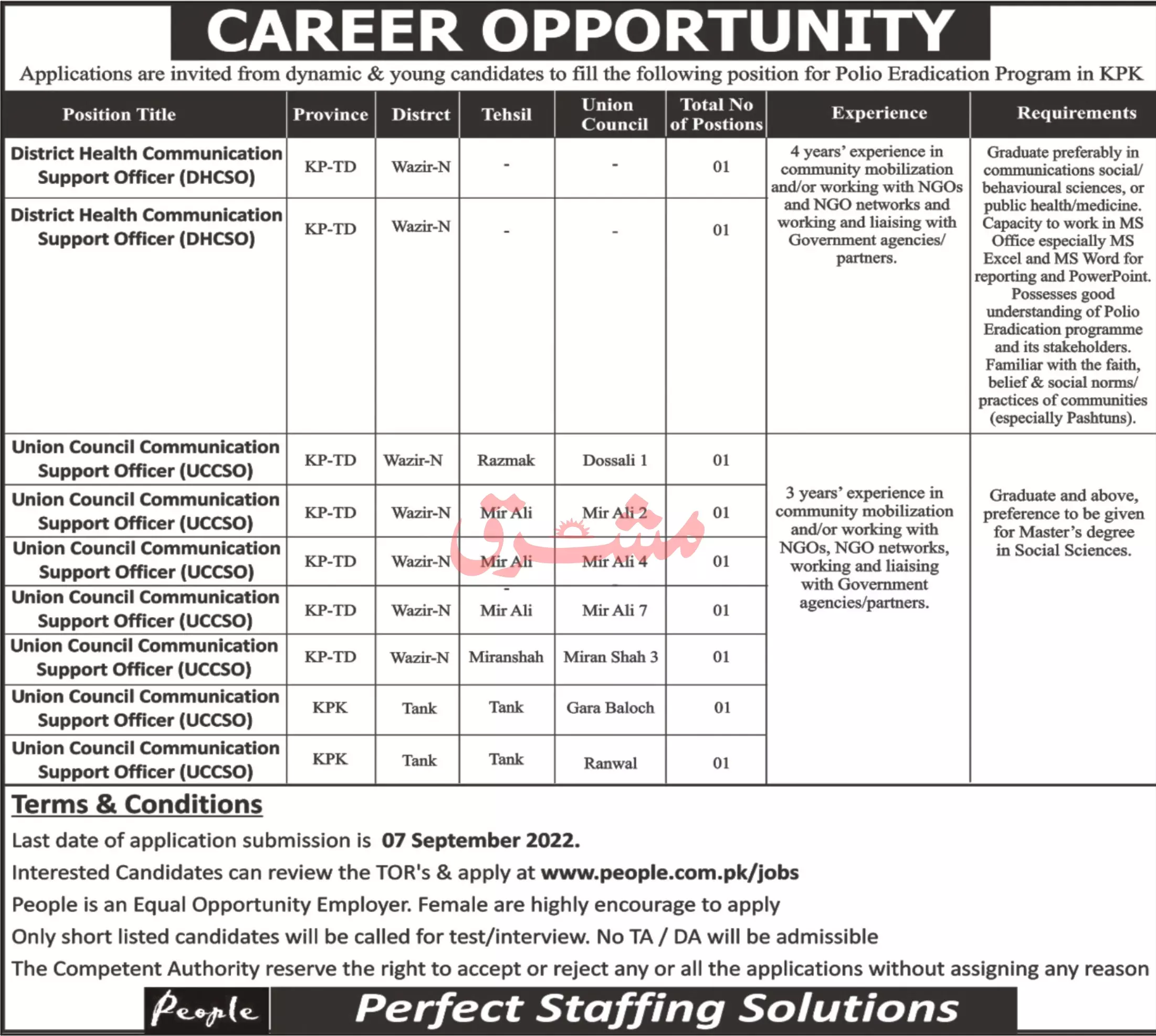 Polio Eradication Programs Khyber Pakhtunkhwa Jobs 2022 announce the Contract career opportunities for the post of See Below Ad in Khyber Pakhtunkhwa,Peshawar for the fresh and experienced candidates on Contract basis who have Check Advertisement degree. Posted date of this post is 04/09/2022 and the last date is 07/09/2022. if you are eligible for this job apply before due date.