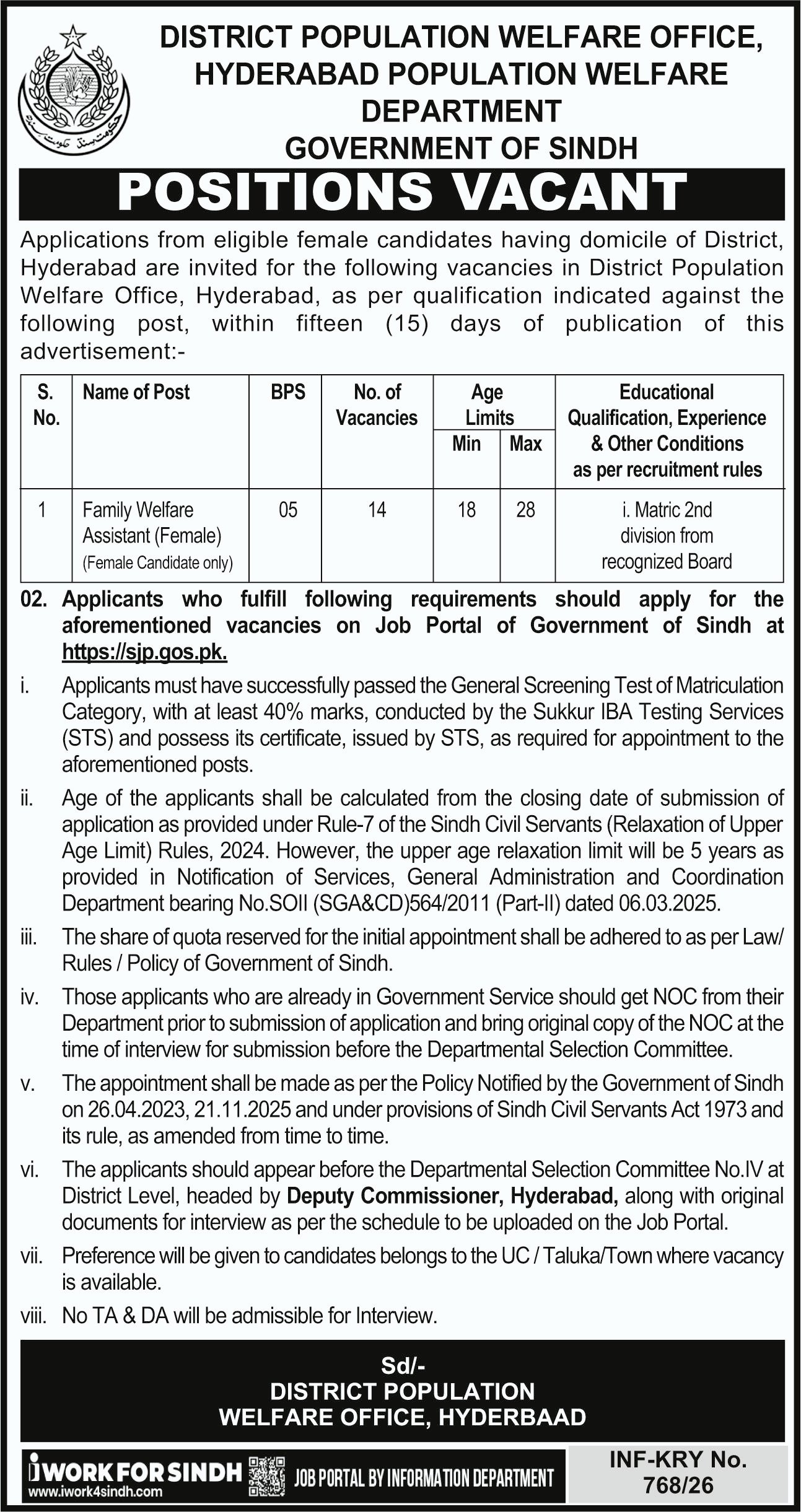 Population Welfare Department PWD Hyderabad Jobs 2026 announce the Contract career opportunities for the post of See Below Ad in Sindh, Hyderabad for the fresh and experienced candidates on Contract basis who have Check Advertisement degree. Posted date of this post is 26/02/2026 and the last date is 12/03/2026. if you are eligible for this job apply before due date.