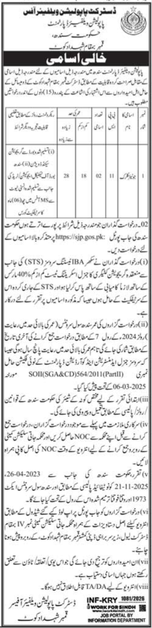 Population Welfare Department Qambar Shahdadkot Job announce the Contract career opportunities for the post of See Below Ad in Sindh, Qambar Shahdadkot for the fresh and experienced candidates on Contract basis who have Check Advertisement degree. Posted date of this post is 15/03/2026 and the last date is 30/03/2026. if you are eligible for this job apply before due date.