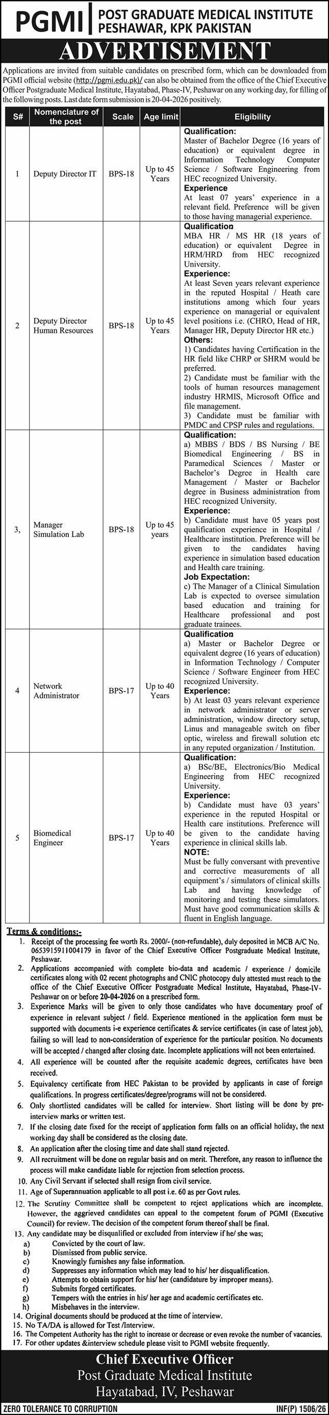 1. Application forms should reach the office of the undersigned within 20 days of the publication of this advertisement on a prescribed form available from the office of the Chief Executive Officer, Post Graduate Medical Institute, Hayatabad, Peshawar during office hours or can be downloaded from www.pgmi.edu.pk.