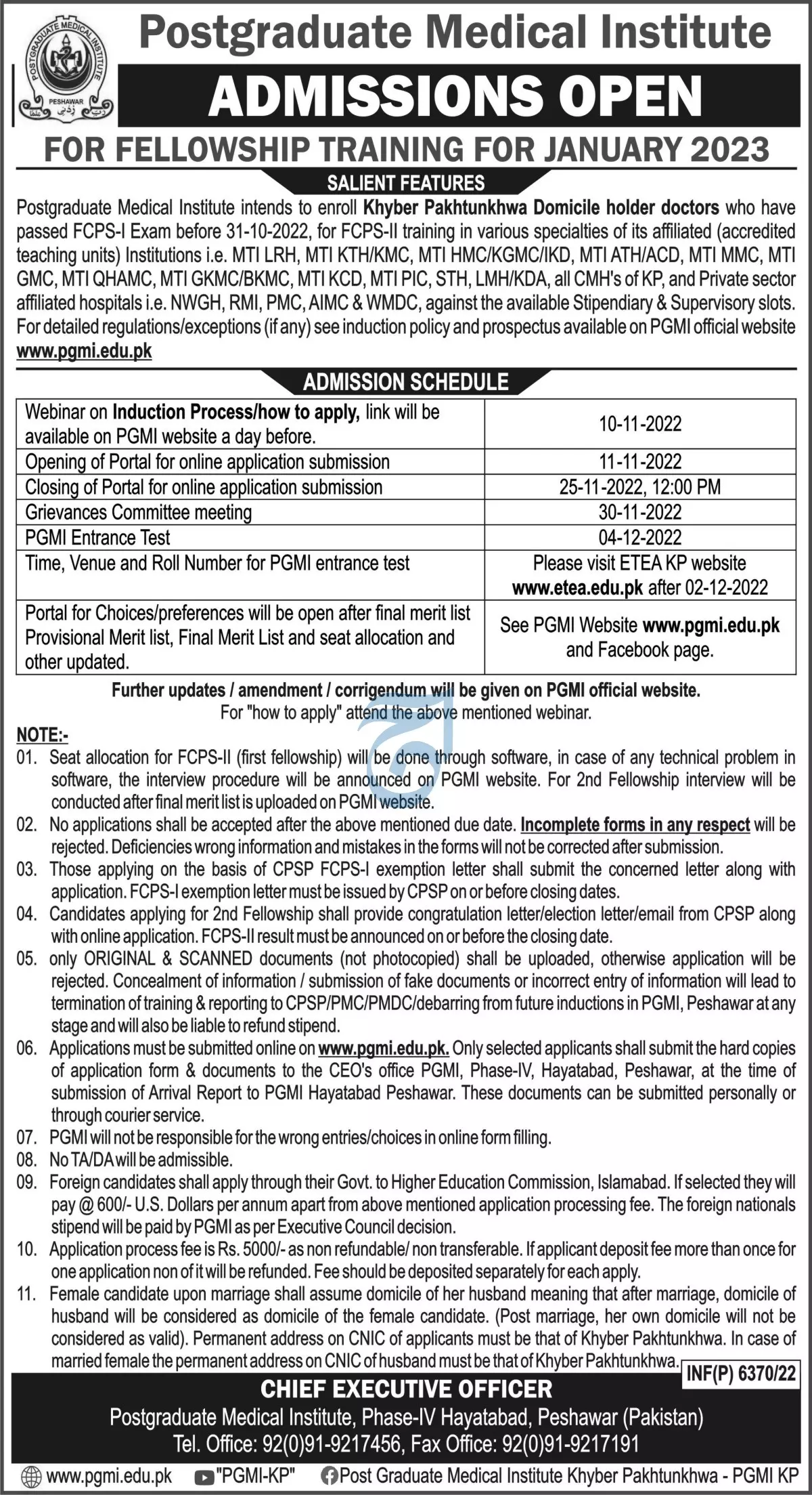 Postgraduate Medical institute Peshawar Admissions 2022 announce the Contract career opportunities for the post of See Below Ad in Khyber Pakhtunkhwa, Peshawar for the fresh and experienced candidates on Contract basis who have Check Advertisement degree. Posted date of this post is 08/11/2022 and the last date is 25/11/2022. if you are eligible for this job apply before due date.