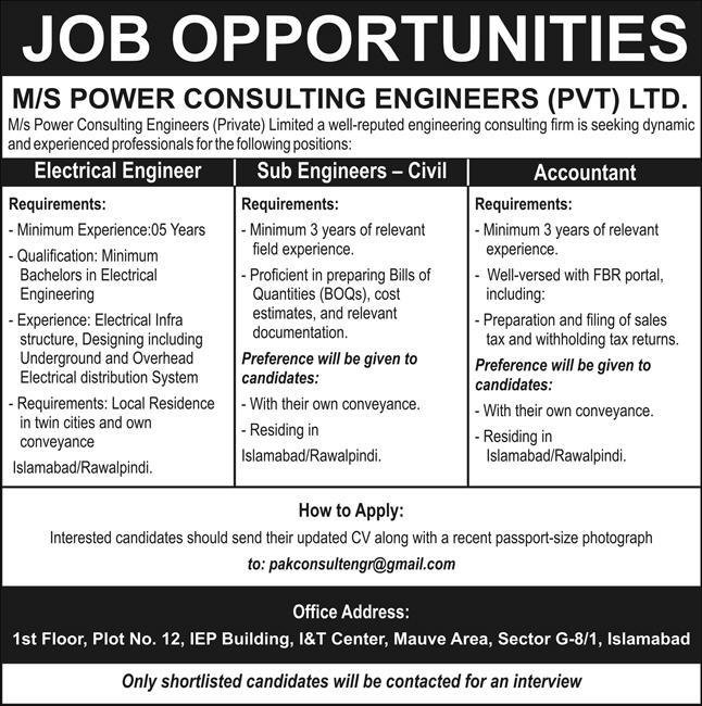 Power Consulting Engineers Private Limited Jobs 2025 announce the Contract career opportunities for the post of See Below Ad in Federal, Islamabad for the fresh and experienced candidates on Contract basis who have Check Advertisement degree. Posted date of this post is 02/11/2025 and the last date is 27/11/2025. if you are eligible for this job apply before due date.