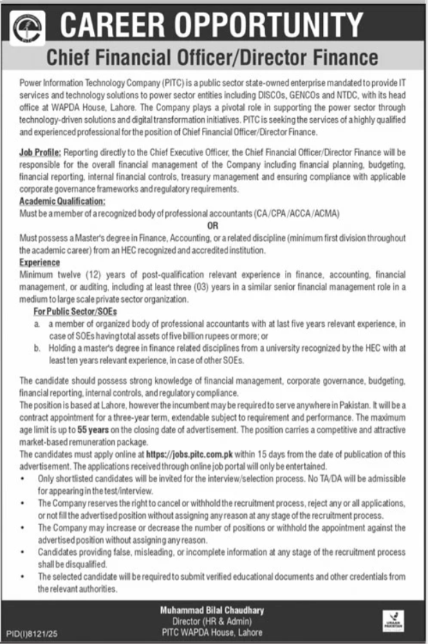 Power Information Technology Company (PITC) is a public sector state-owned enterprise mandated to provide IT services and technology solutions to power sector entities including DISCOS, GENCOs and NTDC, with its head office at WAPDA House, Lahore. The Company plays a pivotal role in supporting the power sector through technology-driven solutions and digital transformation initiatives. PITC is seeking the services of a highly qualified and experienced professional for the position of Chief Financial Officer/Director Finance.
