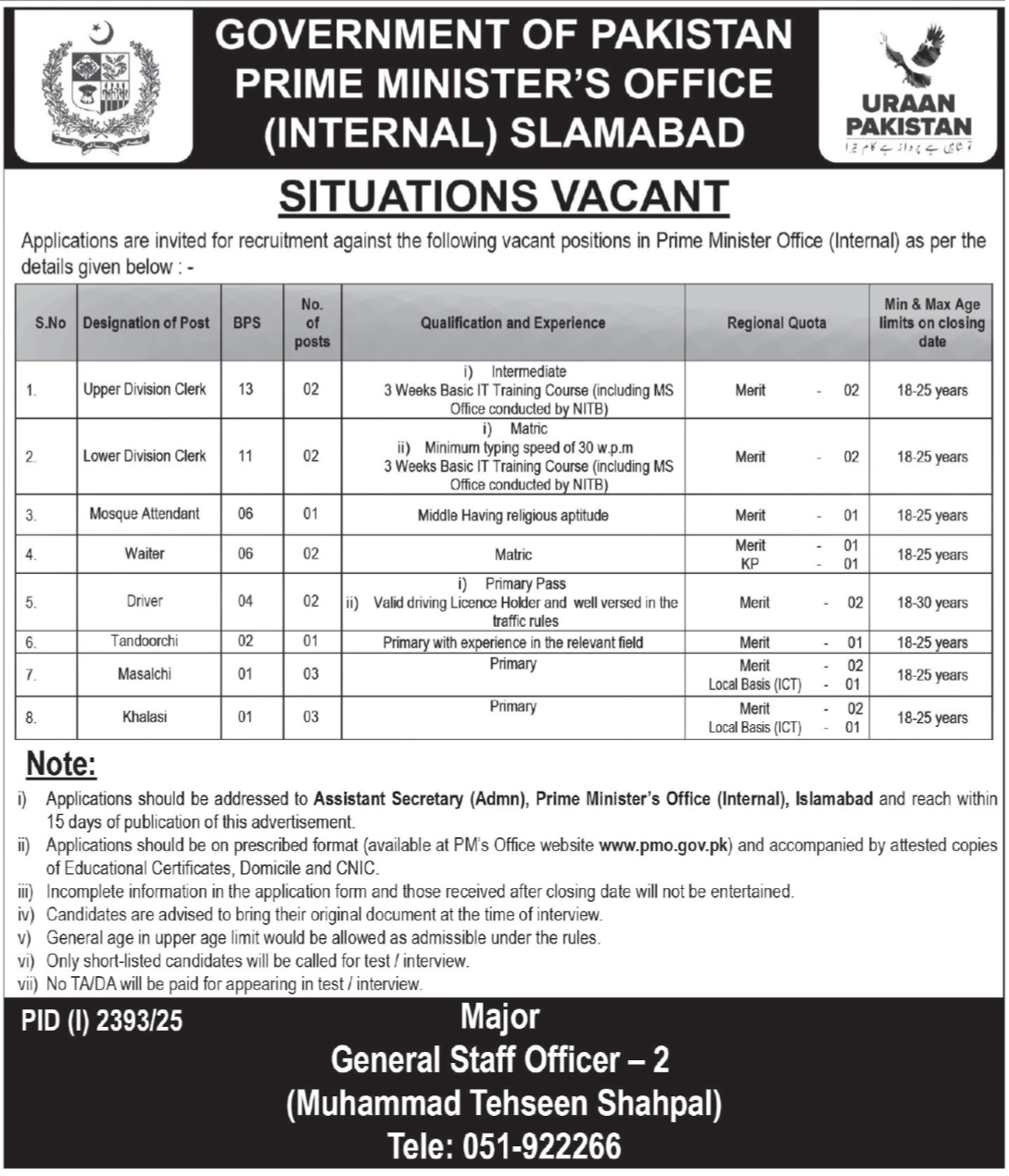 Prime Minister Office Islamabad Jobs 2025 announce the Contract career opportunities for the post of See Below Ad in Federal, Islamabad for the fresh and experienced candidates on Contract basis who have Check Advertisement degree. Posted date of this post is 21/09/2025 and the last date is 06/10/2025. if you are eligible for this job apply before due date.