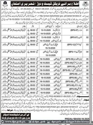To all applicants, male and female, who had submitted their applications for the recruitment of vacant posts under the advertisement number 950/31-08-2025, dated 01-09-2025, of the Inspector General of Prisons, Balochistan. The lists of eligible male and female candidates whose documents have been verified and found correct have been displayed on the notice boards of all prison offices and the office of the Inspector General of Prisons, as well as on the website http://prison.balochistan.gov.pk/career-tenders-21. The schedule for the physical test and written exam for all eligible candidates has been announced, which will be held from 13-10-2025 to 16-10-2025 according to the following schedule. All candidates must bring their original roll number slip and original identity card. No travel allowance or daily allowance will be given to any candidate.