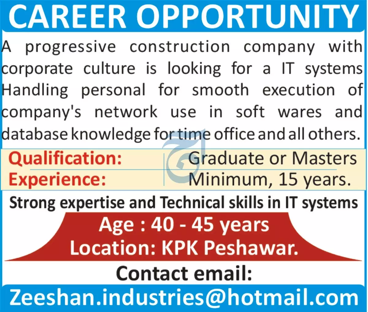- A progressive construction company with corporate culture is looking for a IT systems Handling personal for smooth execution of company's network use in soft wares and database knowledge for time office and all others.