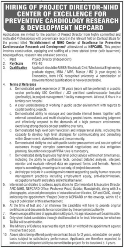 Interested candidates to address applications to (Commandant & Executive Director AFIC-NIHD, NEPCARD Office, Peshawar Road, Saddar, Rawalpindi), along with 3 x photographs, attested photocopies of educational certificates, CV and CNIC, clearly indicating the appointment "Project Director NEPCARD on the envelop, within 12 x days of publication of this advertisement.