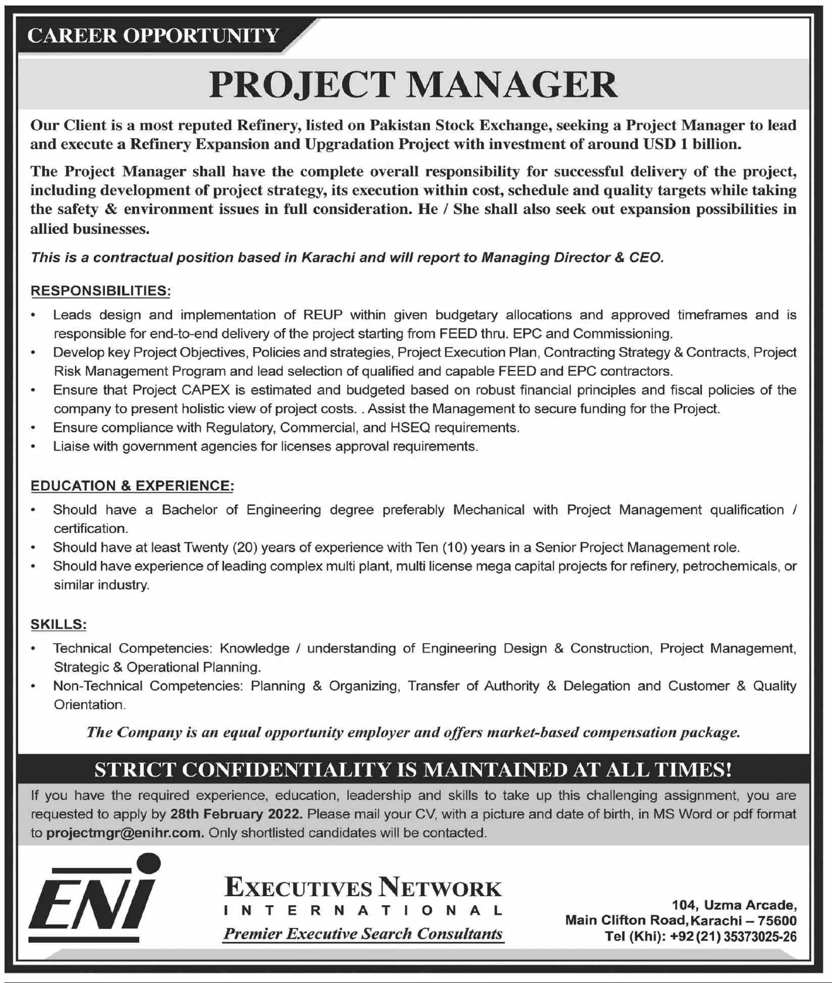 PROJECT MANAGER JOBS announce the Contract career opportunities for the post of See Below Ad in Karachi for the fresh and experienced candidates on Contract basis who have Check Advertisement degree. Posted date of this post is 14/02/2022 and the last date is 28/02/2022. if you are eligible for this job apply before due date.