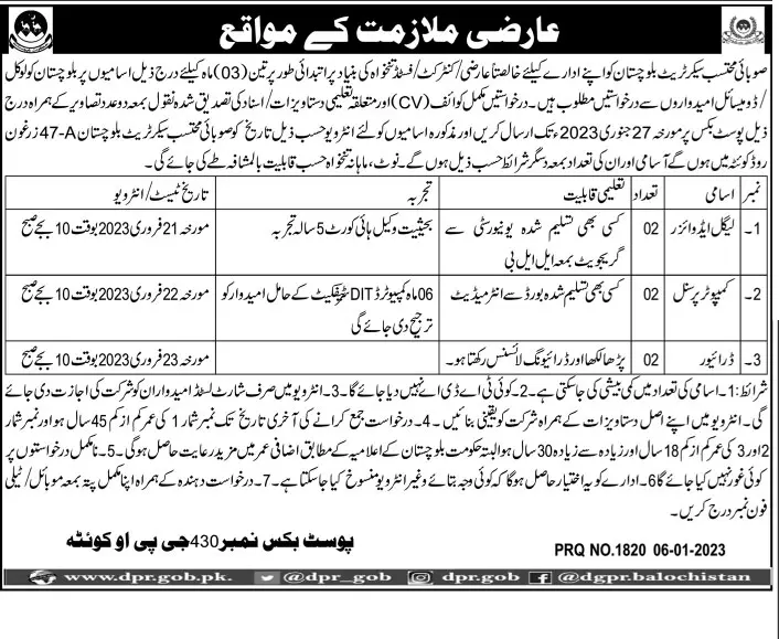 - Provincial Mohtasib Secretariat Balochistan requires Legal Advisors, Computer Personal Assistants, and Drivers. Candidates having Intermediate and Bachelor’s Degree Qualifications can apply for these vacancies.