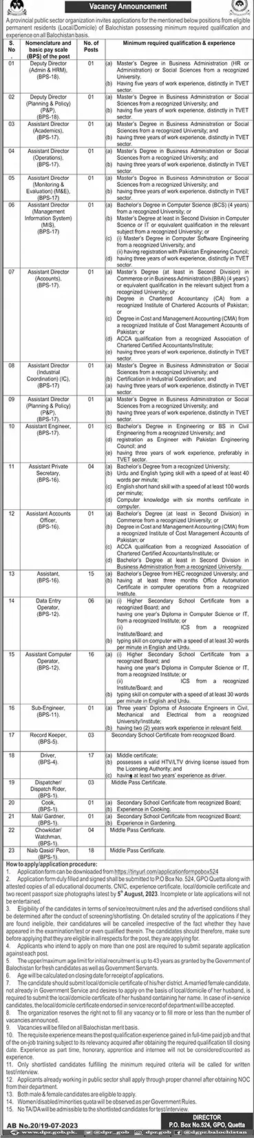 Provincial Public Sector Organization Balochistan Jobs 2023 announce the Contract career opportunities for the post of See Below Ad in Balochistan, Quetta for the fresh and experienced candidates on Contract basis who have Check Advertisement degree. Posted date of this post is 20/07/2023 and the last date is 05/08/2023. if you are eligible for this job apply before due date.