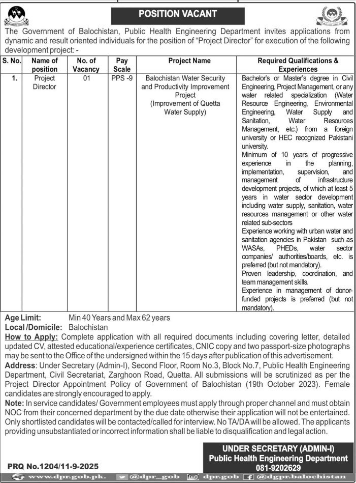 How to Apply: Complete application with all required documents including covering letter, detailed updated CV, attested educational/experience certificates, CNIC copy and two passport-size photographs may be sent to the Office of the undersigned within the 15 days after publication of this advertisement. Address: Under Secretary (Admin-I), Second Floor, Room No.3, Block No.7, Public Health Engineering Department, Civil Secretariat, Zarghoon Road, Quetta. All submissions will be scrutinized as per the Project Director Appointment Policy of Government of Balochistan (19th October 2023). Female candidates are strongly encouraged to apply. Note: In service candidates/ Government employees must apply through proper channel and must obtain NOC from their concerned department by the due date otherwise their application will not be entertained. Only shortlisted candidates will be contacted/called for interview. No TA/DA will be allowed. The applicants providing unsubstantiated or incorrect information shall be liable to disqualification and legal action.