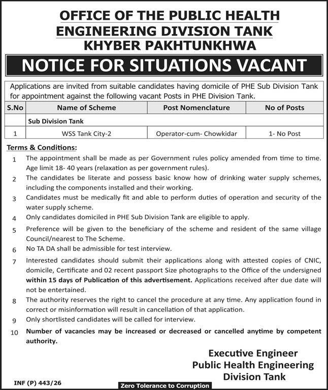 Public Health Engineering Division PHED Tank Jobs 2026 announce the Contract career opportunities for the post of See Below Ad in Khyber Pakhtunkhwa, Tank for the fresh and experienced candidates on Contract basis who have Check Advertisement degree. Posted date of this post is 31/01/2026 and the last date is 14/02/2026. if you are eligible for this job apply before due date.