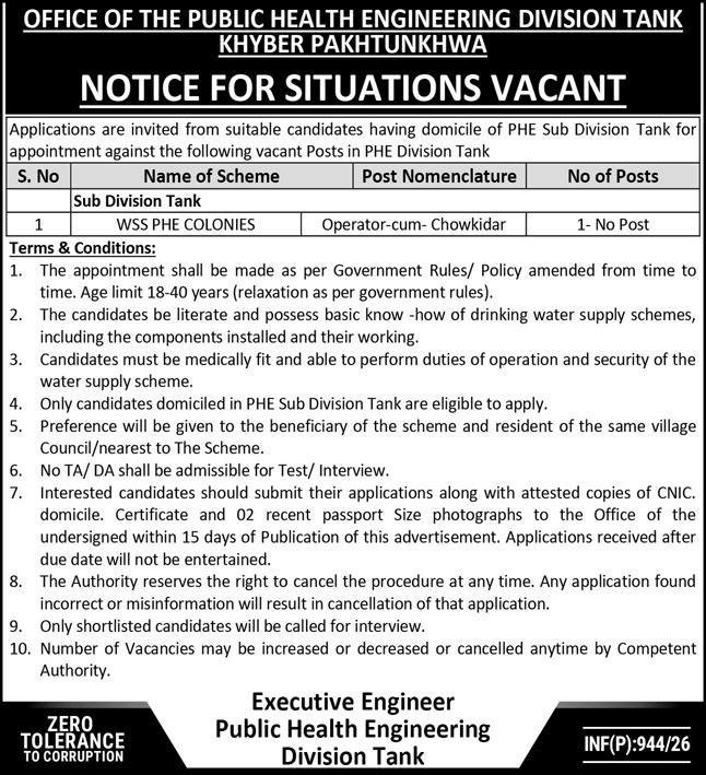 Public Health Engineering Division PHED Tank Jobs 2026 announce the Contract career opportunities for the post of See Below Ad in Khyber Pakhtunkhwa,Tank for the fresh and experienced candidates on Contract basis who have Check Advertisement degree. Posted date of this post is 28/02/2026 and the last date is 14/03/2026. if you are eligible for this job apply before due date.