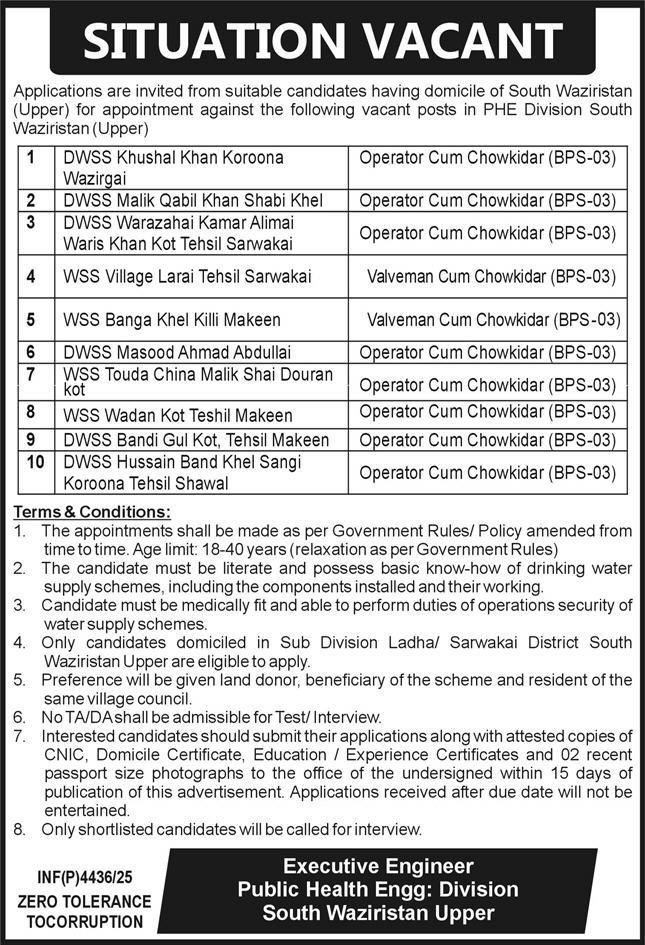 Applications are invited from suitable candidates having domicile of South Waziristan (Upper) for appointment against the following vacant posts in PHE Division South Waziristan (Upper).