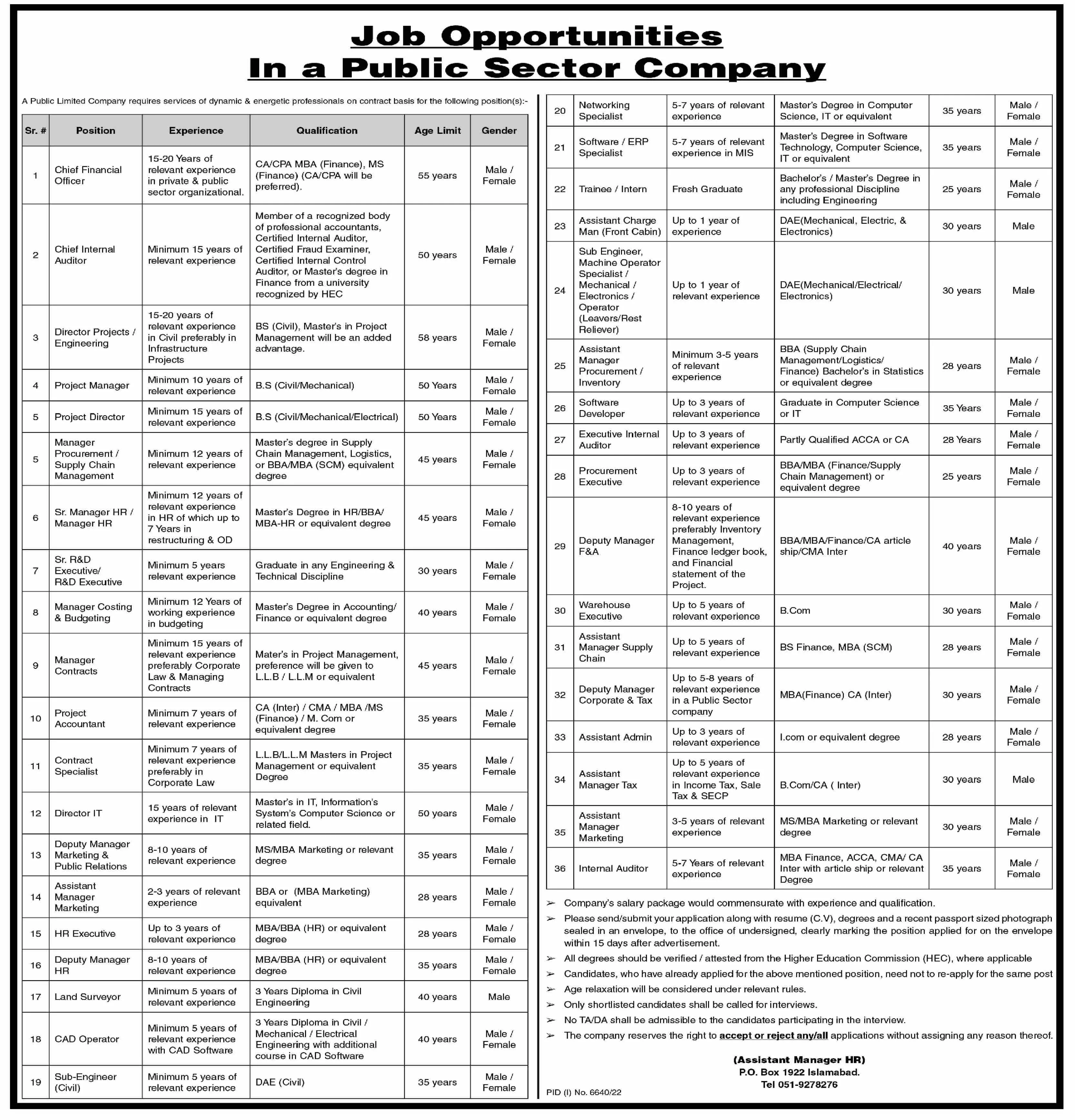 - ➤ Company's salary package would commensurate with experience and qualification. Please send/submit your application along with resume (C.V), degrees and a recent passport sized photograph sealed in an envelope, to the office of undersigned, clearly marking the position applied for on the envelope within 15 days after advertisement.