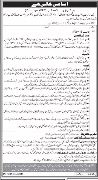 Public Private Partnership Support Facility Jobs 2023 announce the Contract career opportunities for the post of See Below Ad in Sindh, Karachi for the fresh and experienced candidates on Contract basis who have Check Advertisement degree. Posted date of this post is 07/08/2023 and the last date is 22/08/2023. if you are eligible for this job apply before due date.