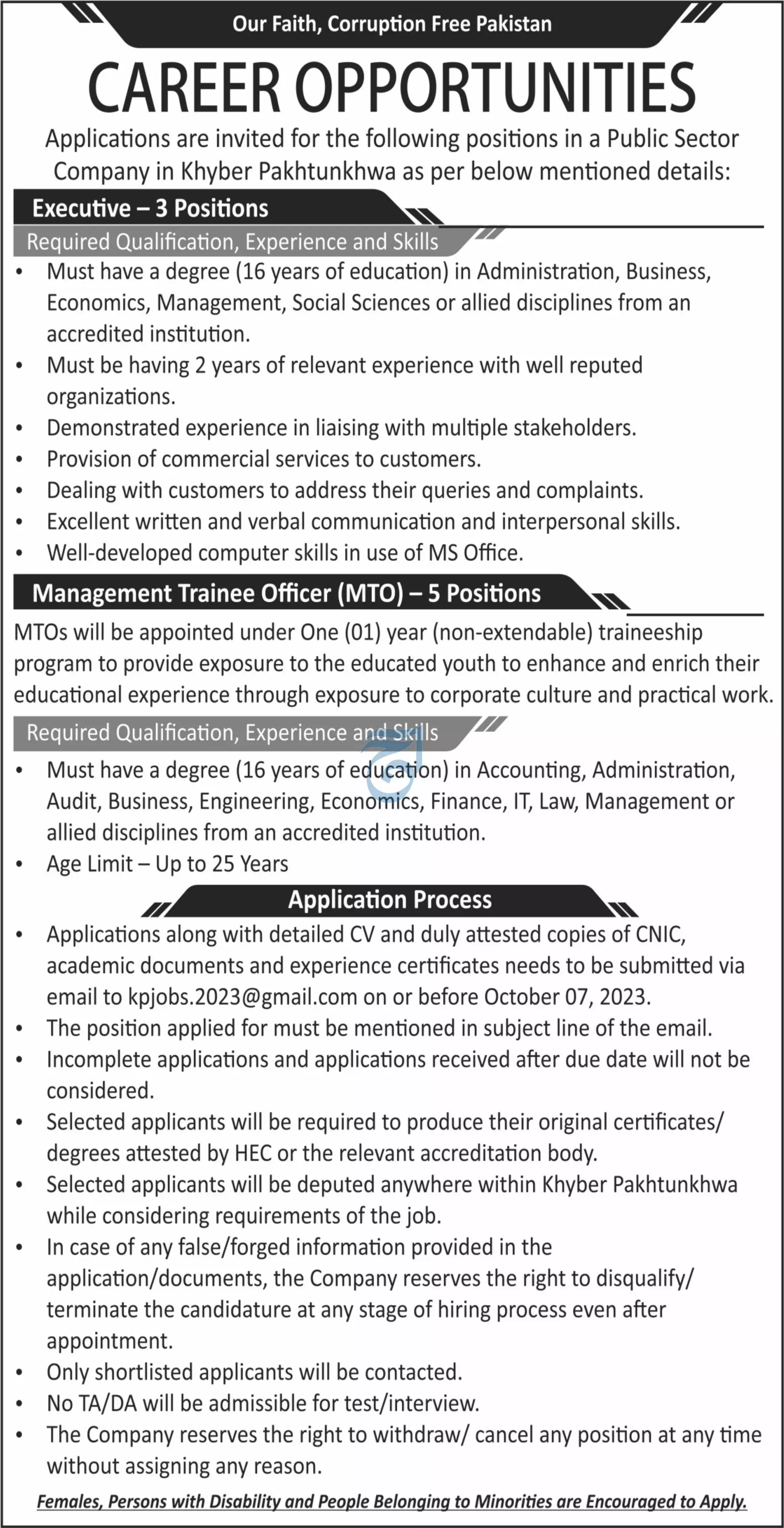 - Applications along with detailed CV and duly attested copies of CNIC, academic documents and experience certificates needs to be submitted via email to kpjobs.2023@gmail.com on or before October 07, 2023.