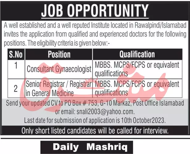 A well established and a well reputed Institute located in Rawalpindi/Islamabad invites the application from qualified and experienced doctors for the following positions.