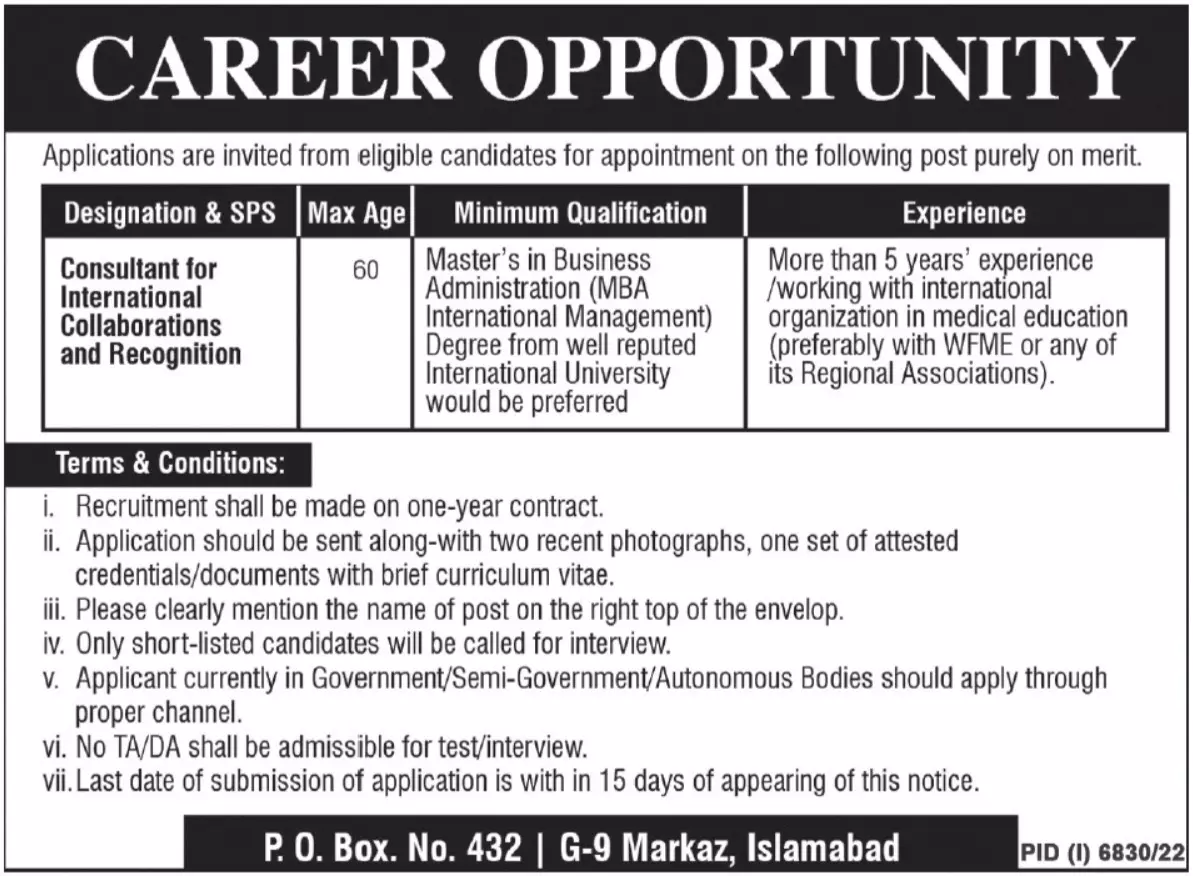 - Public Sector Organization jobs advertisement dated about 10 May 2023 in daily Nawaiwaqt Newspaper invites application for the vacant post of consultant for international collaboration recognition in Islamabad, islamabad Islamabad Pakistan. Candidates with MBA and Master etc. educational background will be preferred.