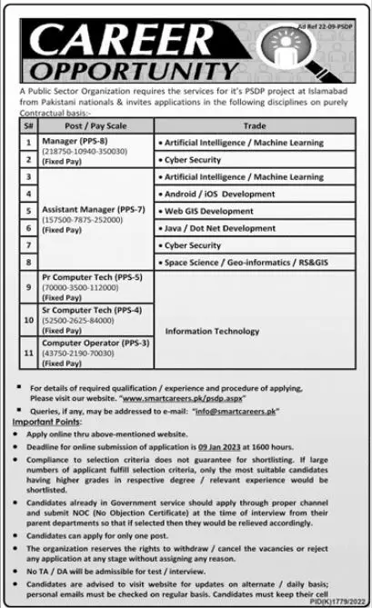 Public Sector organization Islamabad Jobs 2023 announce the Contract career opportunities for the post of See Below Ad in Federal, Islamabad for the fresh and experienced candidates on Contract basis who have Check Advertisement degree. Posted date of this post is 25/12/2022 and the last date is 09/01/2023. if you are eligible for this job apply before due date.