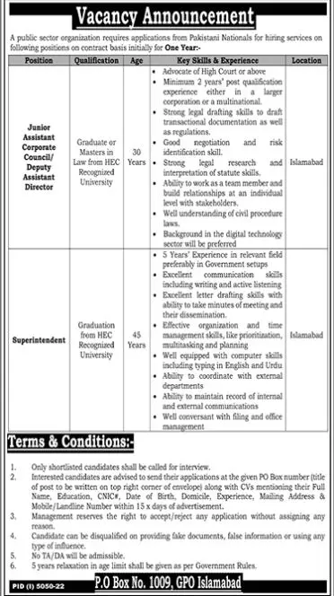 Public Sector Organization Islamabad Jobs 2023