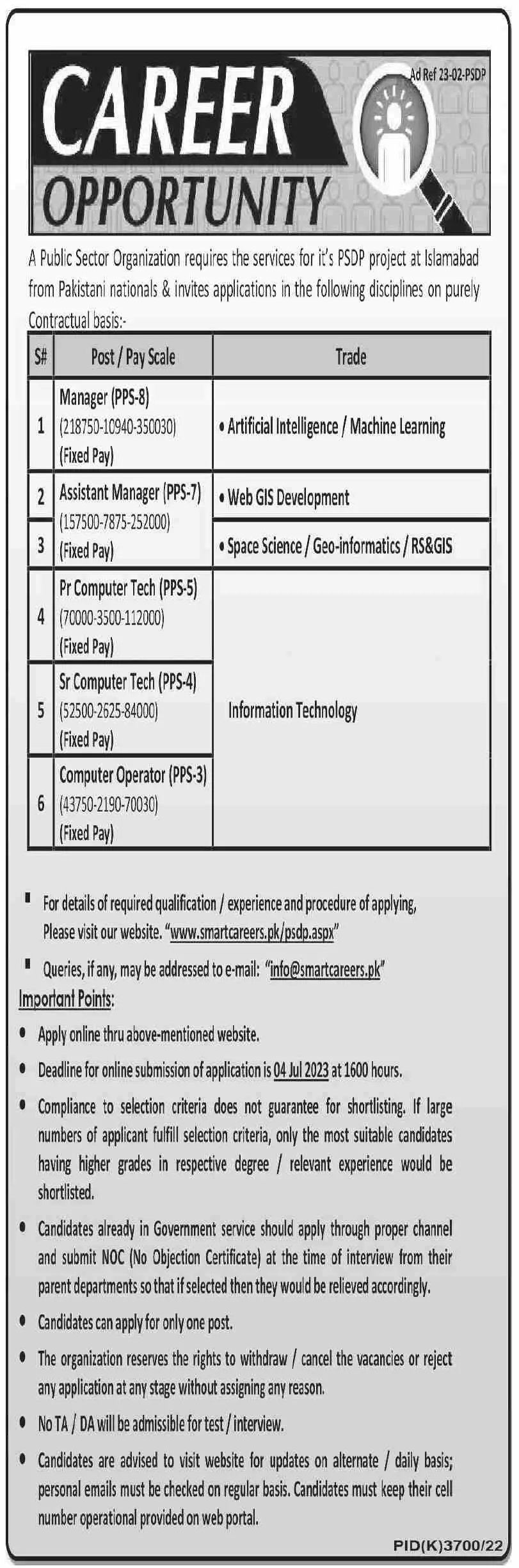- For details of required qualification / experience and procedure of applying, Please visit our website. "www.smartcareers.pk/psdp.aspx"