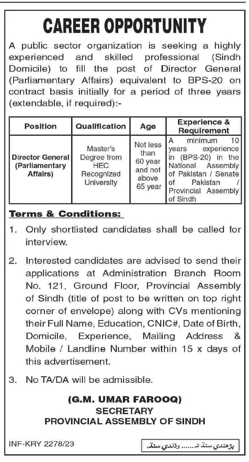 - 3. No TA/DA will be admissible.(G.M. UMAR FAROOQ) SECRETARYPROVINCIAL ASSEMBLY OF SINDH