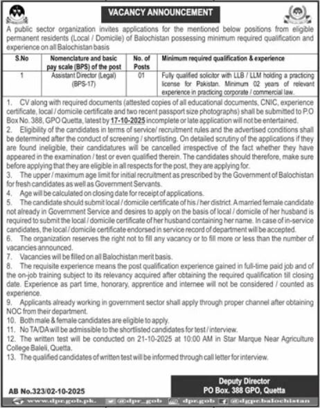 Public Sector Organization Quetta Jobs 2025 announce the Contract career opportunities for the post of See Below Ad in Balochistan, Quetta for the fresh and experienced candidates on Contract basis who have Check Advertisement degree. Posted date of this post is 03/10/2025 and the last date is 17/10/2025. if you are eligible for this job apply before due date.
