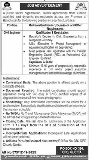 Public Sector Organization Quetta Jobs 2025 announce the Contract career opportunities for the post of See Below Ad in Balochistan, Quetta for the fresh and experienced candidates on Contract basis who have Check Advertisement degree. Posted date of this post is 13/12/2025 and the last date is 28/12/2025. if you are eligible for this job apply before due date.