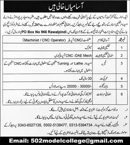 502 Model College is looking for candidates for following posts as per job advertisement published in daily Express Newspaper of October 8, 2023 for location Rawalpindi, rawalpindi Punjab Pakistan: cnc operator and machinist