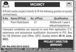 - Interested candidates are required to send their application, C.V. experience and educational qualification documents to P.O. Box No.126 (Pakistan post Office, GPO, Quetta) before 06 th June,2023.PROJECT DIRECTOR (BWRDSP)AB No.492/30-5-2023www.prgb.pk.go