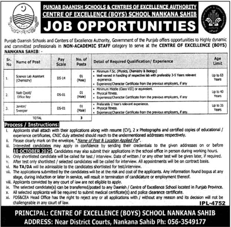 Punjab Daanish Schools Nankana Sahib Jobs 2025 announce the Contract career opportunities for the post of See Below Ad in Punjab, Nankana Sahib for the fresh and experienced candidates on Contract basis who have Check Advertisement degree. Posted date of this post is 24/09/2025 and the last date is 10/10/2025. if you are eligible for this job apply before due date.