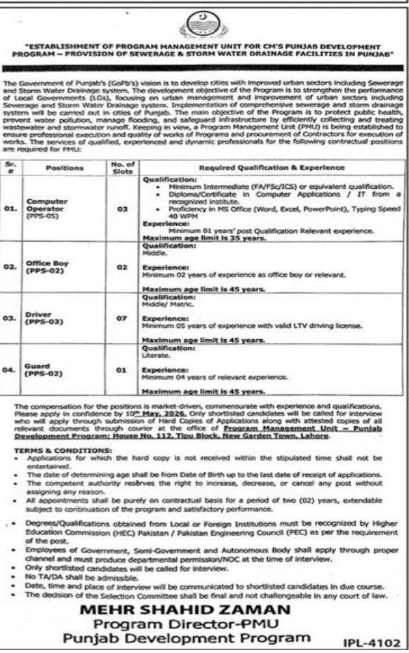 Punjab Development Program Lahore Jobs 2026 announce the Contract career opportunities for the post of See Below Ad in Punjab, Lahore for the fresh and experienced candidates on Contract basis who have Check Advertisement degree. Posted date of this post is 26/04/2026 and the last date is 09/05/2026. if you are eligible for this job apply before due date.