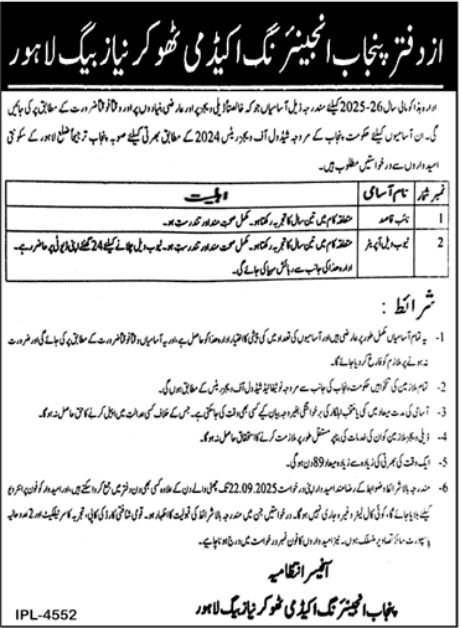 Punjab Engineering Academy PEA Lahore Job 2025 announce the Contract career opportunities for the post of See Below Ad in Punjab, Lahore for the fresh and experienced candidates on Contract basis who have Check Advertisement degree. Posted date of this post is 11/09/2025 and the last date is 25/09/2025. if you are eligible for this job apply before due date.