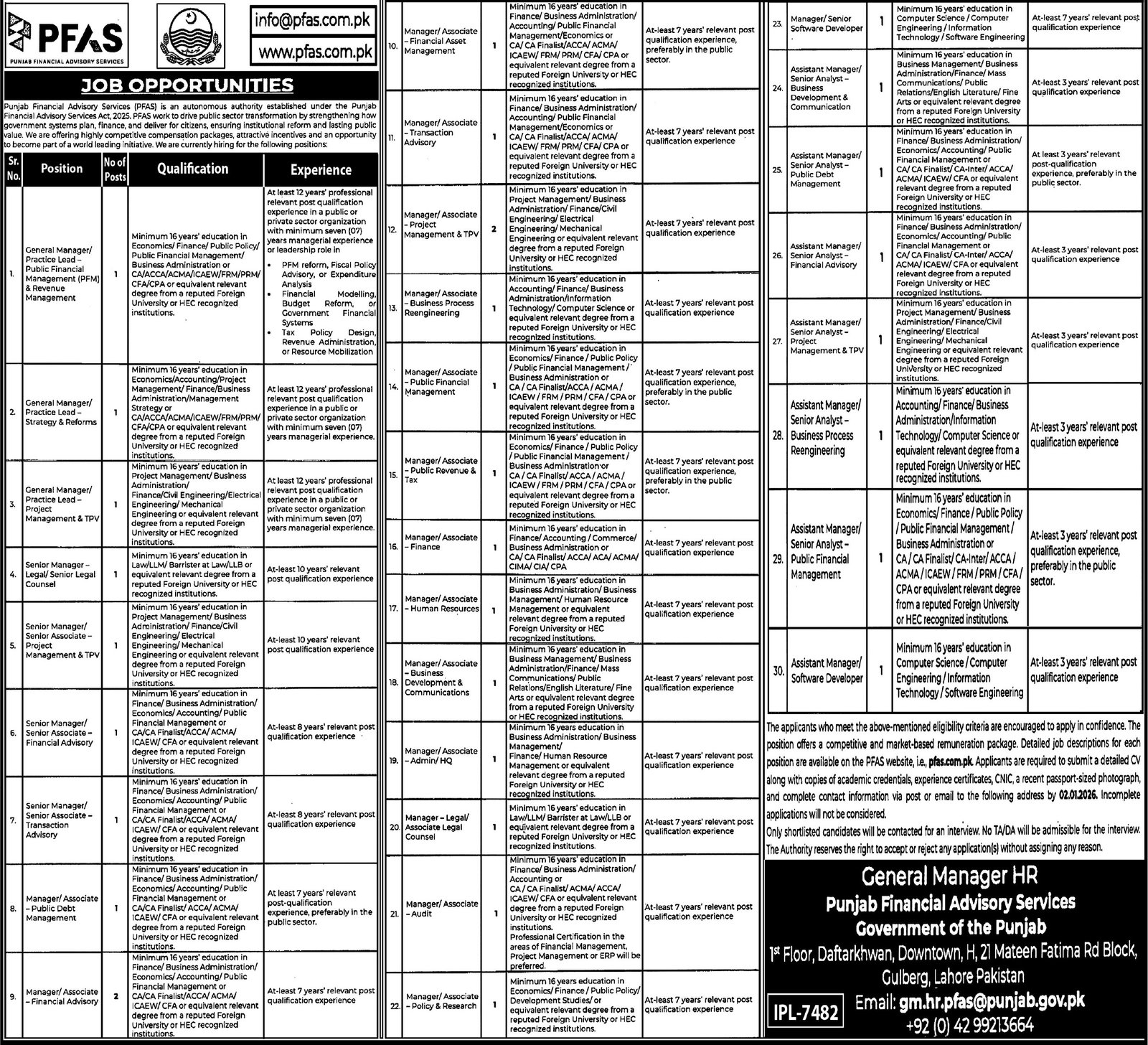 Punjab Financial Advisory Services (PFAS) is an autonomous authority established under the Punjab Financial Advisory Services Act, 2025. PFAS work to drive public sector transformation by strengthening how systems plan, finance, and deliver for citizens, ensuring institutional reform and lasting public impact. We are offering highly competitive compensation packages, attractive incentives and an opportunity to lead leading initiatives and are currently hiring for the following positions: