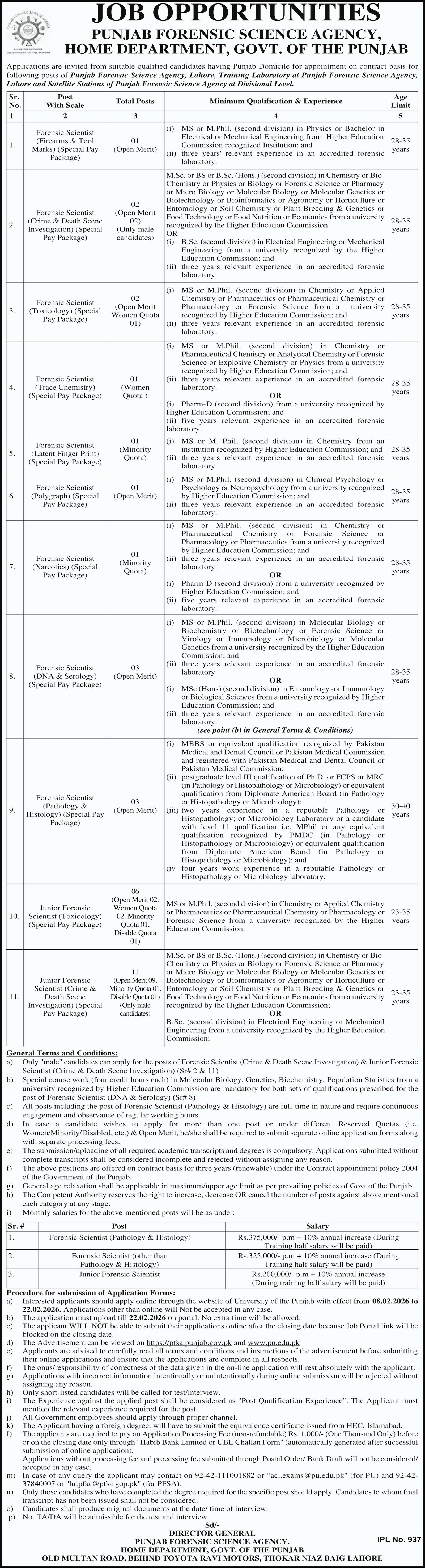 Punjab Forensic Science Agency PFSA Lahore Jobs 2026 announce the Contract career opportunities for the post of See Below Ad in Punjab, Lahore for the fresh and experienced candidates on Contract basis who have Check Advertisement degree. Posted date of this post is 27/01/2026 and the last date is 22/02/2026. if you are eligible for this job apply before due date.