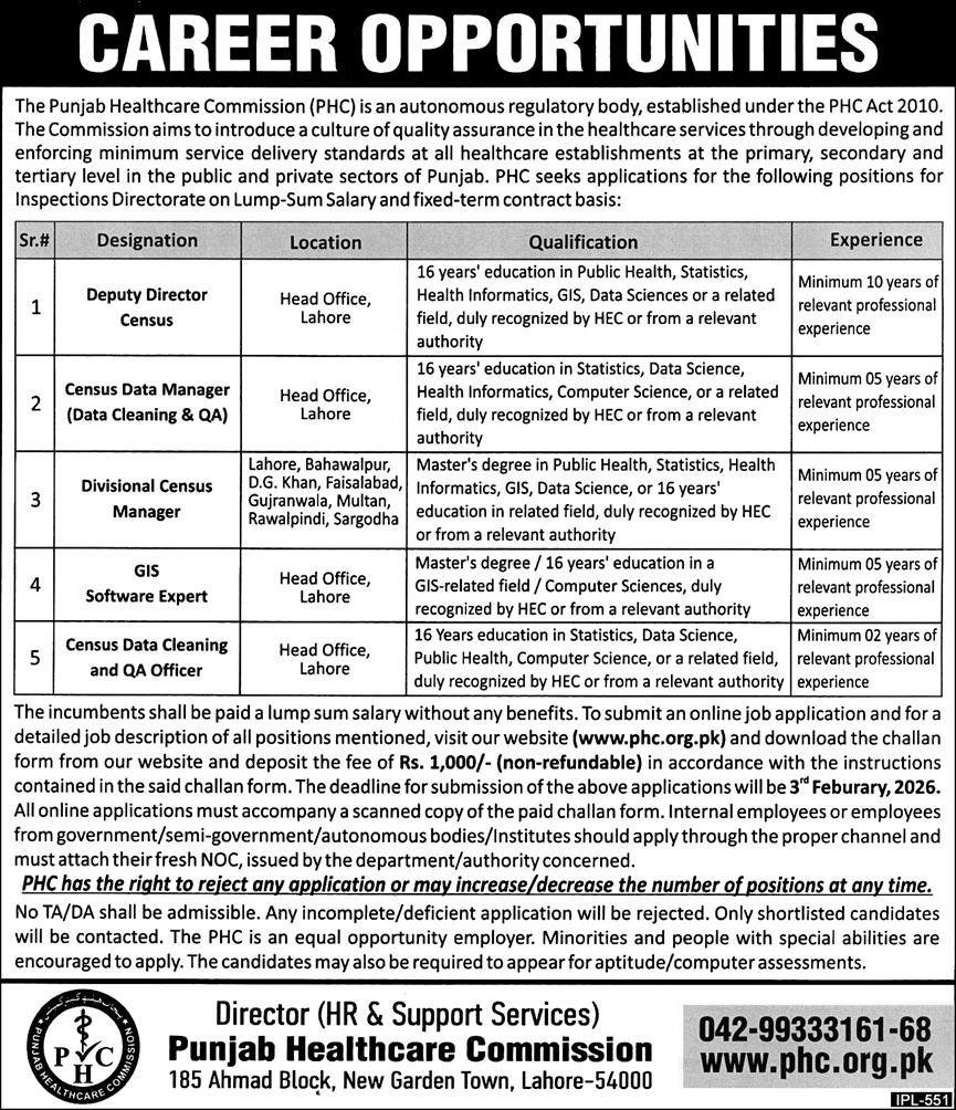 Punjab Healthcare Commission PHC Lahore Jobs 2026 announce the Contract career opportunities for the post of See Below Ad in Punjab, Lahore for the fresh and experienced candidates on Contract basis who have Check Advertisement degree. Posted date of this post is 16/01/2026 and the last date is 03/02/2026. if you are eligible for this job apply before due date.