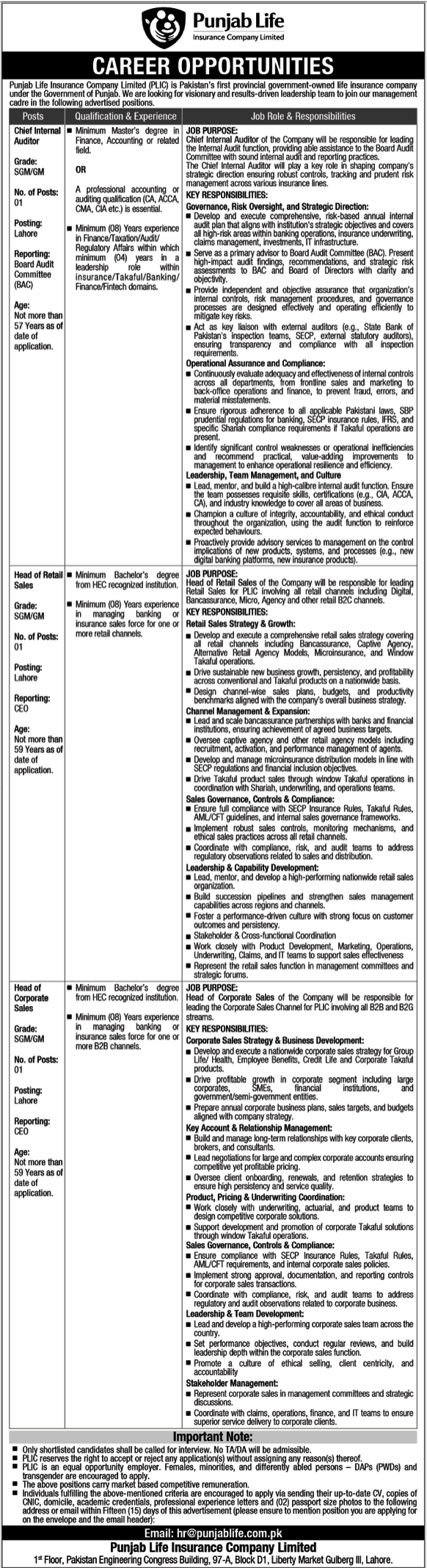 Punjab Life Insurance Company Limited invites applications from dynamic and result-oriented professionals for the following positions: