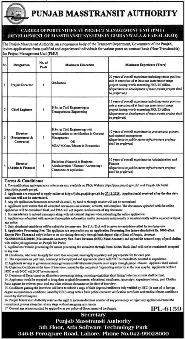 Punjab Masstransit Authority PMA Lahore Jobs 2025 announce the Contract career opportunities for the post of See Below Ad in Punjab, Lahore for the fresh and experienced candidates on Contract basis who have Check Advertisement degree. Posted date of this post is 12/11/2025 and the last date is 27/11/2025. if you are eligible for this job apply before due date.