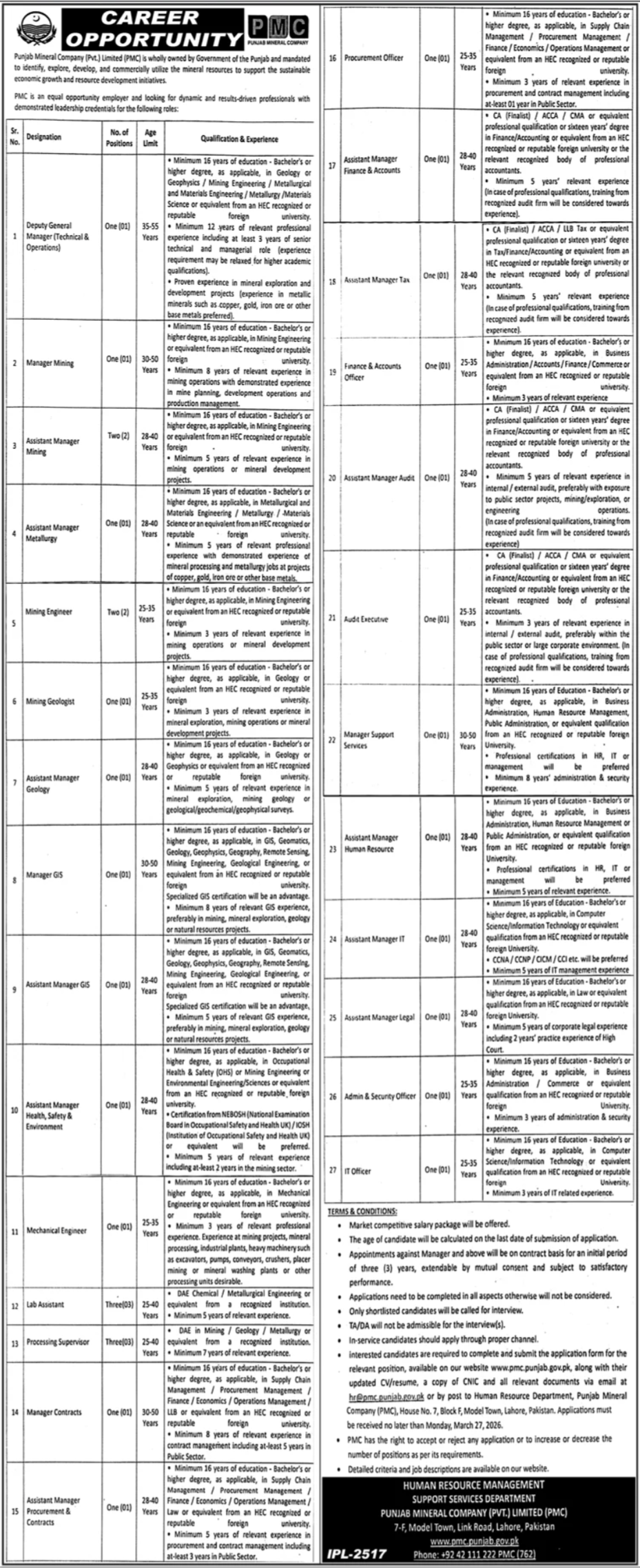 Punjab Mineral Company Pvt Ltd Lahore Jobs Notice 2026 announce the Contract career opportunities for the post of See Below Ad in Punjab, Lahore for the fresh and experienced candidates on Contract basis who have Check Advertisement degree. Posted date of this post is 12/03/2026 and the last date is 27/03/2026. if you are eligible for this job apply before due date.