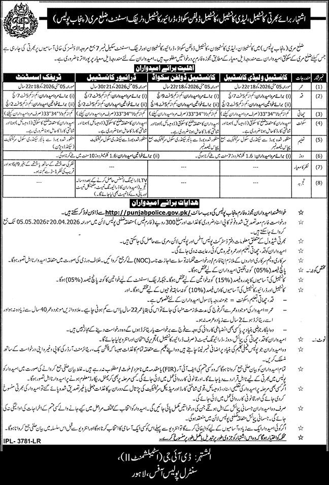 Punjab Police Lahore Jobs 2026 announce the Contract career opportunities for the post of See Below Ad in Punjab, Lahore for the fresh and experienced candidates on Contract basis who have Check Advertisement degree. Posted date of this post is 21/04/2026 and the last date is 05/05/2026. if you are eligible for this job apply before due date.
