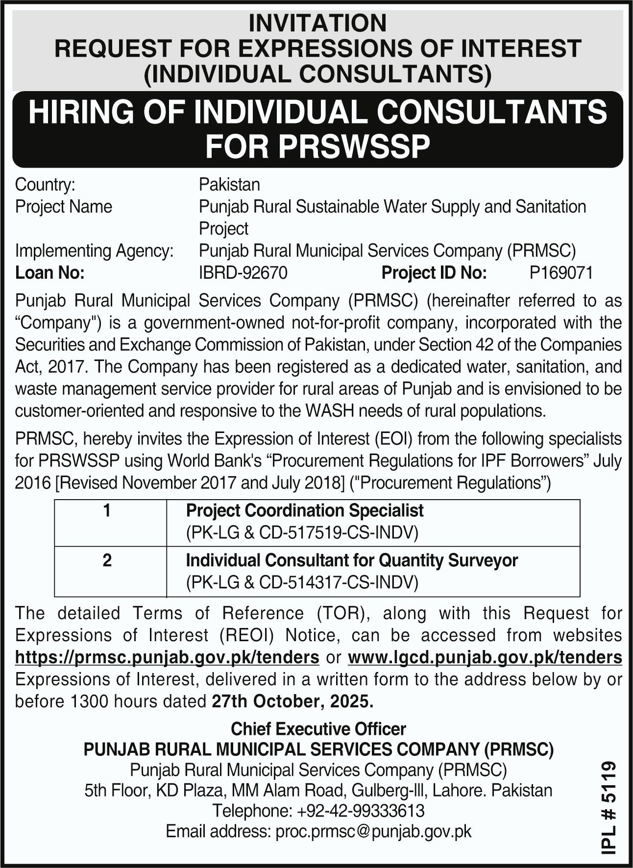 The detailed Terms of Reference (TOR), along with this Request for Expressions of Interest (REOI) Notice, can be accessed from websites https://prmsc.punjab.gov.pk/tenders or www.lgcd.punjab.gov.pk/tenders. Expressions of Interest, delivered in a written form to the address below by or before 1300 hours dated 27th October, 2025.