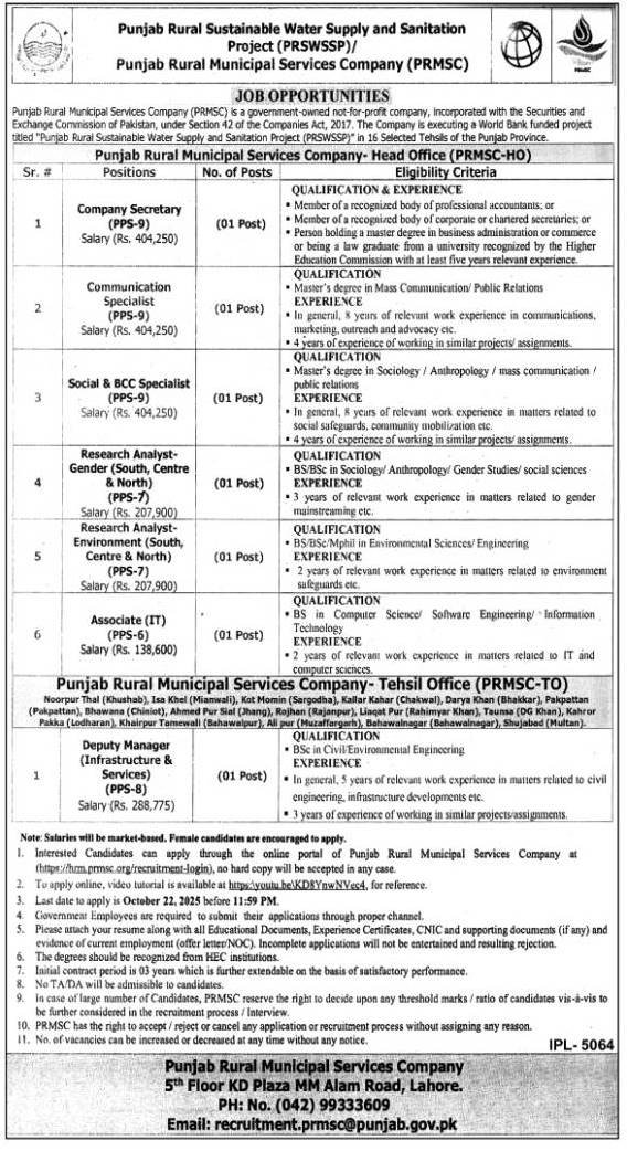 Punjab Rural Municipal Services Company Lahore Jobs 2025 announce the Contract career opportunities for the post of See Below Ad in Punjab, Lahore for the fresh and experienced candidates on Contract basis who have Check Advertisement degree. Posted date of this post is 09/10/2025 and the last date is 22/10/2025. if you are eligible for this job apply before due date.