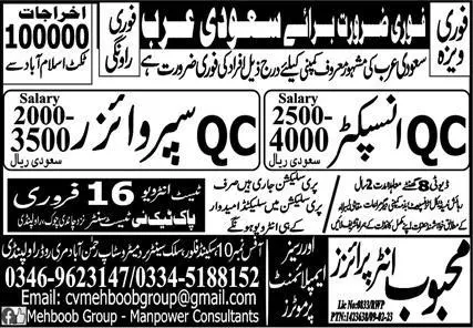 Mehboob Enterprises Overseas Employment Promoters jobs advertisement dated about 10 February 2023 in daily Express Newspaper invites application for the vacant post of qc inspector and qc supervisor in Riyadh, al khobar Saudi Arabia. Matric, Bachelor and Intermediate etc. educational qualification will be preferred.