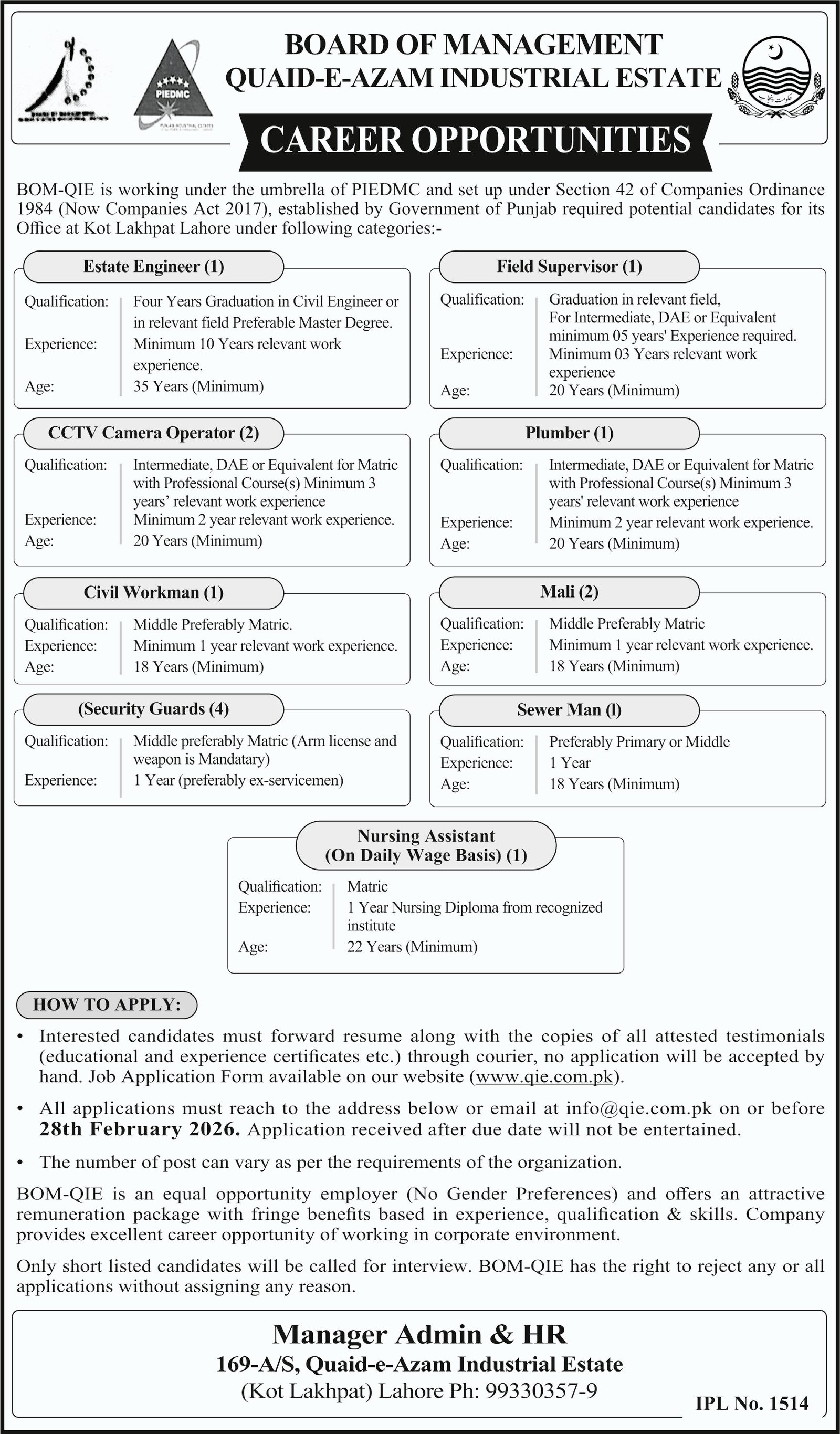 Quaid E Azam Industrial Estate Lahore Jobs 2026 announce the Contract career opportunities for the post of See Below Ad in Punjab, Lahore for the fresh and experienced candidates on Contract basis who have Check Advertisement degree. Posted date of this post is 13/02/2026 and the last date is 28/02/2026. if you are eligible for this job apply before due date.