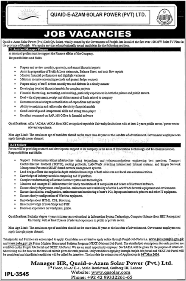 Quaid E Azam Solar Power Jobs 2026 announce the Contract career opportunities for the post of See Below Ad in Punjab, Lahore for the fresh and experienced candidates on Contract basis who have Check Advertisement degree. Posted date of this post is 11/04/2026 and the last date is 04/05/2026. if you are eligible for this job apply before due date.