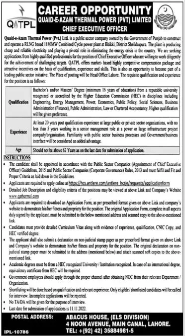 Quaid-e-Azam Thermal Power (Pvt) Jobs 2022 announce the Contract career opportunities for the post of See Below Ad in Punjab, Lahore for the fresh and experienced candidates on Contract basis who have Check Advertisement degree. Posted date of this post is 26/10/2022 and the last date is 11/11/2022. if you are eligible for this job apply before due date.