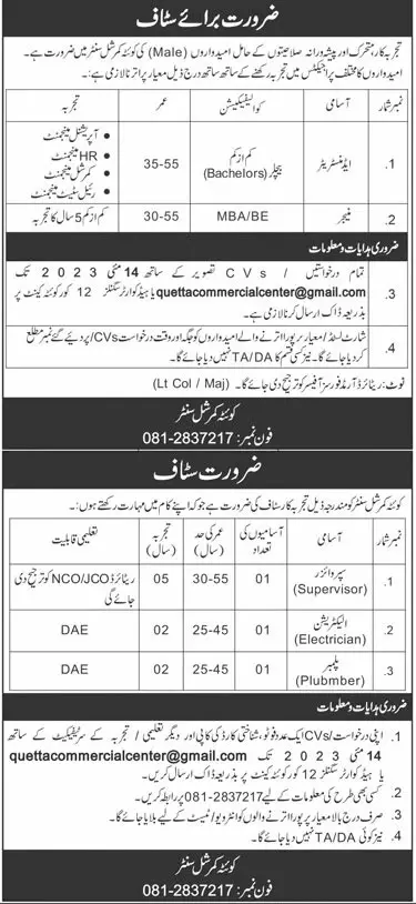 - Vacant posts including plumber, electrician and supervisor are announced in Quetta Commercial Centre Quetta, quetta Balochistan Pakistan as per 10 May 2023 advertisement in daily Jang Newspaper. Persons with Bachelor, DAE and Intermediate etc. education can apply.